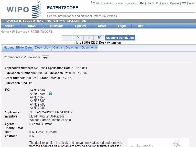 دخلت جامعة السلطان قابوس في قاعدة بيانات براءات الاختراع للمنظمة العالمية للملكية الفكرية ” الويبو” لأول مرة عبر اختراع معاذ الرقادي المتمثل في أداة لتوسيع مساحة الطاولات الدراسية. وقالت شيخة بنت ناصر الأخزمية رئيسة قسم الملكية الفكرية والقائمة بأعمال مدير دائرة الابتكار وريادة الأعمال بجامعة السلطان قابوس إن دخول اسم الجامعة ضمن قاعدة بيانات براءات الاختراع في ” الويبو” جاء نتيجة منحها براءات اختراع من المكتب الأمريكي لبراءات الاختراع، حيث يعد المركز الأمريكي لبراءات الاختراع ضمن مكاتب الملكية الفكرية المرتبطة بقاعدة بيانات المنظمة العالمية للملكية الفكرية. وأوضحت الأخزمية أن هذا الحضور العالمي للجامعة يعد أحد المعايير الرئيسة في تصنيف الجامعات، كما أن نشر براءات الاختراع من خلال قاعدة البيانات في “الويبو” يتيح فرصا لإيجاد مستثمرين وأصحاب أعمال قد يكونون مهتمين بتقنيات الابتكارات الممنوحة ، حيث تعد قاعدة البيانات هذه مقصدا للباحثين عن التقنيات الجديدة وما يطلق عليهم سماسرة الاختراعات وربما قد تنتج عنها عقود تراخيص للتقنية.وأكدت الأخزمية أن هذا الإنجاز يعد انطلاقة ودافعا إلى تحفيز المبتكرين للإفصاح عن ابتكاراتهم للدائرة، وهذا يعد دلالة على أننا نخطو في الطريق الصحيح لجعل عمان تبتكر. وأشارت شيخة الأخزمية إلى أن هناك المزيد من براءات الاختراعات التي قدمتها الجامعة في مجال التعليم الهندسي ويتم حاليا فحصها لدى المكتب الأمريكي لبراءات الاختراع، كما أنه يتم حاليا تقييم معيار الحداثة لعدد من الابتكارات في مجال تقنية النانو. جدير بالذكر أن ” الويبو” منظمة دولية تابعة للأمم المتحدة، وهي تعمل من أجل حماية الحقوق الملكية الفردية للأفراد، وقد ظهرت في سنة 1967 وتأسست سنة 1974.